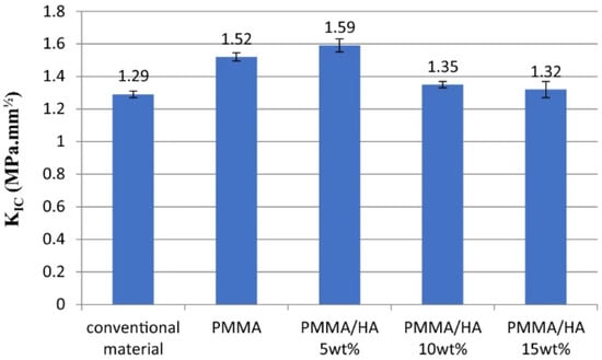 Effect of filler loading on the fracture toughness of PMMA/HA nanocomposite compared to the conventional material and neat PMMA. Reprinted from ref. [], copyright 2020, MDPI.