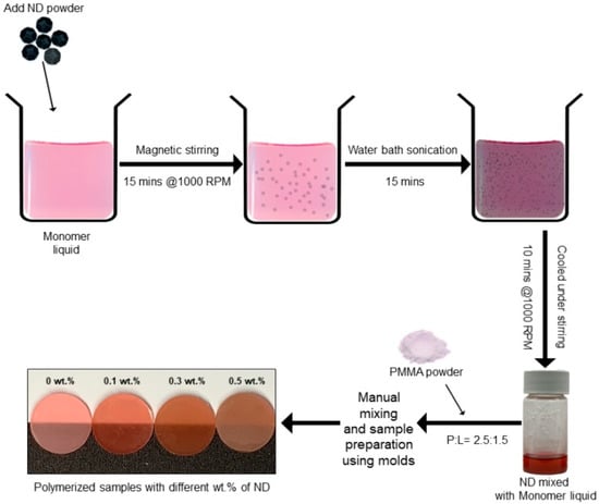 Representation of the preparation of PMMA/ND nanocomposites. Reprinted from ref. [], copyright 2019, MDPI.