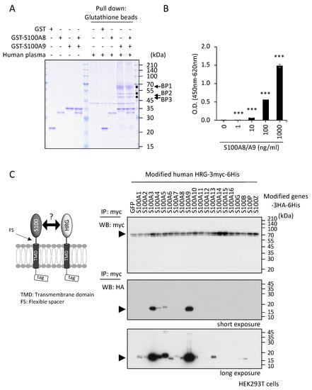 Identification of HRG as a binding protein to S100A8/A9. (A) Recombinant proteins (GST, GST-S100A8, GST-S100A9) were prepared from the E. coli expression system. Ten micrograms of each individual single protein or a preincubated mixture of GST-S100A8 and GST-S100A9 (GST-S100A8/A9) was incubated with human plasma (1 mL) collected from a healthy volunteer donor. After incubation for 30 min at room temperature under gentle shaking, the GST proteins were all pulled down by the addition of glutathione-conjugated Sepharose beads. After the beads were washed extensively, the bound proteins were eluted with glutathione and subjected to SDS-PAGE for analysis. The Coomassie brilliant blue (CBB)-stained gel displayed three clear bands (BP1, 2, and 3) that co-shed with GST-S100A9 and GST-S100A8/A9. (B) Interaction of S100A8/A9 with HRG was confirmed by ELISA. A 96-well plate coated with the highly purified human recombinant HRG protein (100 µg/mL) was incubated with the indicated concentrations of biotinylated human recombinant S100A8/A9 protein after blocking with a chemical-based reagent, Blockmaster DB1130, that is very good for quenching the nonspecific binding of S100A8/A9. The binding of S100A8/A9 to HRG was detected by treatment with HRP-conjugated streptavidin and the chemical reaction between the HRP and the substrate used. The background values of S100A8/A9 binding from the wells without HRG coating were deducted. Data are expressed as optical density (O.D.) means ± SD. *** p < 0.001 by Student’s t-test. (C) Schematic drawing of the method used to detect the interaction between S100 family proteins and HRG on the HEKT293 cell surface (left). To effectively increase the probability of interaction between S100 proteins and HRG in the extracellular space, all proteins were modified to express in a membrane-anchored form, so that their density was much greater on the narrow cell surface than in the vast extracellular space. HEK293T cells were co-transfected with myc-tagged modified HRG and HA-tagged S100 family-expressing vectors. After the immunoprecipitation of the expressed cell-surface HRG with myc antibody-conjugated beads, the interacting cell surface S100 proteins were detected by the HA antibody (right).