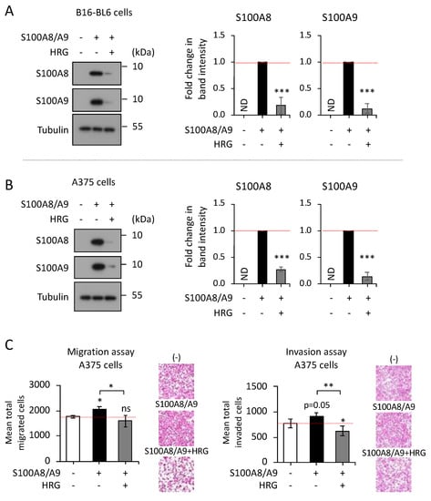 Cell invasion or migration was assayed using the Boyden chamber method with filter inserts (pore size, 8 μm) pre-coated or not pre-coated with Matrigel in 24-well plates (BD Biosciences, Franklin Lakes, NJ, USA). A375 cells (5 × 104 cells/insert) were seeded with a low-serum RPMI medium (0.5% FBS) on the top chamber, and the bottom chamber was filled with a 10% FBS-supplemented conventional RPMI medium. Recombinant S100A8/A9 was then set in the bottom chamber at a final concentration of 1 μg/mL with purified HRG protein or BSA at a final concentration of 100 μg/mL. In melanoma patients, although the level of S100A8/A9 in serum was previously reported to be 1–15 μg/mL [], our study showed that 1 μg/mL of S100A8/A9 had the highest levels of migration and invasion activity in A375 cells in the Boyden chamber method (our unpublished data). We therefore decided to use S100A8/A9 at 1 μg/mL. On the other hand, because of the relatively high concentration of HRG in healthy human serum (60–100 μg/mL) [], we used HRG at a final concentration of 100 μg/mL in this evaluation. After incubation for 18 h, cells that passed through the filter were counted by staining with hematoxylin and eosin (H&E). Migrated/invaded cells were imaged under a microscope (BZ-9000; Keyence, Tokyo, Japan), quantified by cell counting in five non-overlapping fields at ×100 magnification, and presented as the average from three independent experiments.
