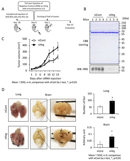 Evaluation of the anti-cancer role of the intrinsic HRG in a mouse model. (A) Schematic representation of the timeline of autonomous metastatic tumor progression in C57BL/6J mice burdened with mouse melanoma (B16-BL6) cells). siHrg or siCont was injected into mice 18 days after the inoculation of melanoma cells (see Materials and Methods for details). (B) On day 13, blood specimens (0.5 µL) were collected from the hearts of all mice and used to confirm that the HRG protein level was lower in the siHrg-treated mice than in the siCont-treated mice. (C) The volumes of B16-BL6 cell derived tumors grown in the individual ears were measured on the indicated days. (D) Lung and brain metastases were monitored by assessing the region of black tissue (melanoma) in images of dissected mouse lungs and brain (left). The clear black foci in the lungs that were greater than 1 mm in diameter were counted as metastatic foci (upper-right image). To evaluate brain metastasis, the intensity of the black area was measured using ImageJ software (lower-right image). Arrows indicate the sites of metastasis. Data are means ± SD. * p < 0.05 by Student’s t-test.