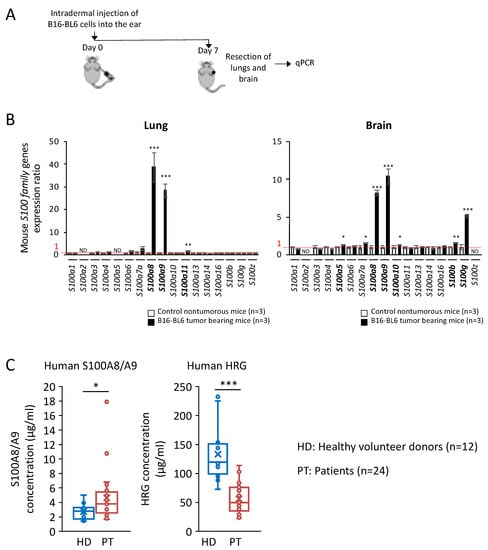 Profiling of the expression pattern of mouse S100 family genes in the premetastatic stage in the lungs and brain of C57BL/6J mice burdened with melanoma (B16-BL6 cells). (A) Lungs and brain were resected from C57BL/6J mice burdened with melanoma (B16-BL6 cells) on day 7 after inoculation of melanoma to the subcutaneous area of the ear. (B) Total RNAs prepared from the indicated organs (lungs and brain) were analyzed for the expression of S100 family genes by quantitative real-time PCR. Tbp mRNA was used as a control for the analysis. The data were expressed as an expression ratio in comparison with the respective values from the healthy lungs and brain of nontumorous control mice, which were set as 1. (C) S100A8/A9 and HRG levels in the plasma collected from brain-metastatic lung cancer patients. The backgrounds of patients are described in Materials and Methods. S100A8/A9 and HRG levels were measured with ELISA. Data in panels (B,C) are means ± SD. * p < 0.05, ** p < 0.01, and *** p < 0.001 by Student’s t-test.