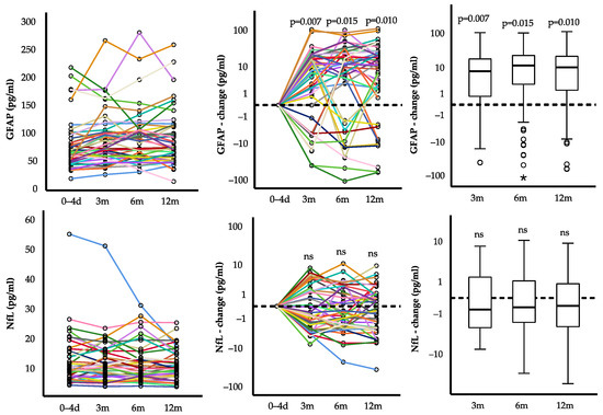 The median serum NfL at baseline was 10.6 (7.2, 14.8) pg/mL and ranged from 4.4 to 55.2 pg/mL. Longitudinal analysis of individual patients revealed a non-significant median change of −0.6 (−2.6, 1.5) pg/mL after 3 months, −0.5 (−2.0, 1.2) pg/mL after 6 months, and −0.4 (−2.5, 1.0) pg/mL 12 months, compared to baseline levels. Thus, we could not detect relevant changes in serum NfL in the year after STEMI.
