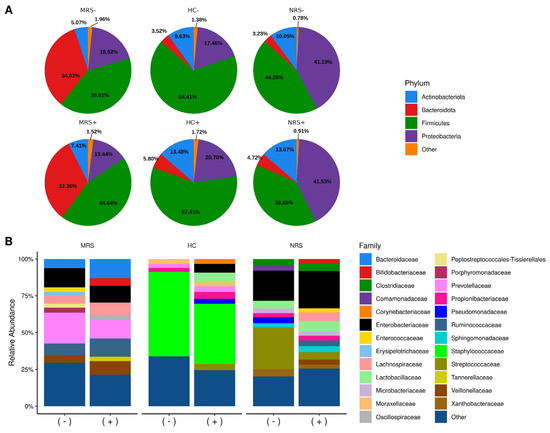 Relative abundances of bacterial taxa in the studied samples. Color sectors indicate taxa as indicated by tags on the right side of the figure; abundances are shown as percentages on the Y-axis. Type of sample is shown on top of the figures: MRS (mother rectal swab), HC (human colostrum), NRS (neonate rectal swab), while positive (+) or negative (−) SARS-CoV-2 genome detection by RT-ddPCR is shown at the bottom. (A) Pie charts show the top four abundant phyla, while “Other” includes phyla with < 1% relative abundance (Supplementary Materials Table S2). (B) Bar plots show the top 25 abundant families (Supplementary Materials Tables S3–S5), while “Other” groups families with < 2.5% relative abundance (Supplementary Materials Table S6).