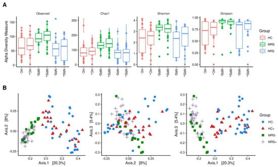 (A) Bacterial alpha diversity in the different studied samples. The type of sample is shown on top of graphics as MRS (Mother Rectal Swab), HC (Human Colostrum), NRS (Neonate Rectal Swab), while positive (+) or negative (−) results for SARS-CoV-2 genome detection by RT-ddPCR are shown at the bottom. The Y-axes indicate the values for the Observed number of species, Chao1, Shannon, and Simpson diversity indexes, respectively. Supplementary Material (Supplementary Materials Table S6). (B) Beta diversity of bacteria in MRS and HC. The graphics show beta-diversity analyses calculated by dissimilarity metrics using features tables and Unweighted UniFrac analysis. The scatter plots were generated using principal coordinates analysis (PCoA) in three different axes showing the percentage of total differences. The positive (+) or negative (−) SARS-CoV-2 genome detection by RT-ddPCR is shown beside the type of labels identified for the samples on the right side of the graphics. MRS and HC differed significantly according to ANOSIM (p = 0.001).