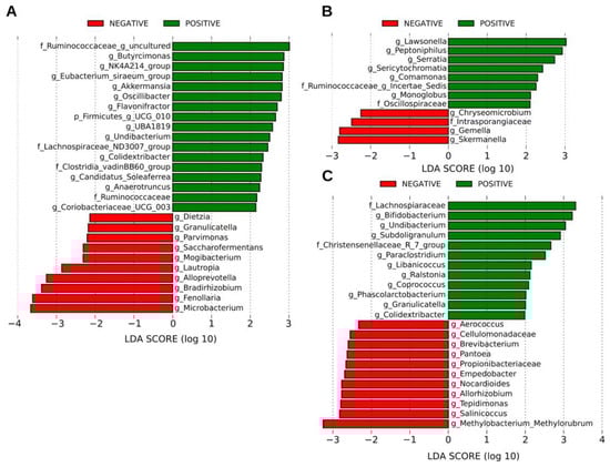 Linear discriminant analysis (LDA) effect size (LEfSe) comparison of differentially abundant bacterial taxa. The figure shows data for (A) MRS (mother rectal swab), (B) HC (human colostrum), and (C) NRS (neonate rectal swab). The effect size for each significant taxon is represented as the log10 transformed LDA score shown by the length of the horizontal bars. The threshold on the logarithmic LDA score for discriminative features was set to 2.0. The names of bacterial taxa with a statistically significant change in relative abundance characterizing each condition are written alongside the horizontal lines. Positive (green color) or negative (red color) SARS-CoV-2 genome detection by RT-ddPCR is shown on top of each graphic. Taxa categories are “c”, class; “o”, order; “f”, family, and “g”, genus. See Supplementary Materials Table S8 for full taxon descriptions and LDA score p-values and q-values.