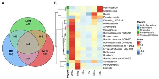 (A) Venn diagram showing shared taxa across MRS (mother rectal swab), red color, HC (human colostrum), blue color, NRS (neonate rectal swab), green color. (B) Differential frequency of bacteria in the studied samples. The heat-map highlights important taxa among MRS, HC, and NRS, while positive (+) or negative (−) SARS-CoV-2 genome detection by RT-ddPCR is shown beside the label. Columns show the abundance of the 20 bacterial genera with the best p-value (p < 0.005) calculated by DESeq (differential gene expression based on the negative binomial distribution) and the phyla to which they belong. The color scale from blue (−3) to red (3) indicates the Wald Test coefficient calculated by DESeq from the feature table, with red more frequent. Color keys for phyla are shown on the right side of the figure. Actinobacteriota = Actinobacteria, Bacteroidota = Bacteroidetes.