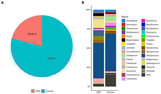 The potential origin of bacteria present in the HC was explored. SourceTracker analysis estimated that approximately 21% of the identified bacteria in the HC had a common source with the bacteria characterized in MRS, while the remaining 79% came from unknown sources (p < 0.006, Wilcoxon signed-rank test) (Figure 5A). The relative abundance of bacteria found in HC classified by the analysis of MRS origin, showed that members of phyla Firmicutes Staphylococcus (46%), and Streptococcus (6%), Proteobacteria Escherichia (11%), Actinobacteria Microbacterium (7%), and Bacteroidetes Prevotella (5%) were more abundant, while the relative abundance of taxa in the Unknown source was dominated by the Firmicutes Staphylococcus (47%), Lactobacillus (4%) and Actinobacteria Cutibacterium (5%) (Figure 5B and Supplementary Materials Table S9).