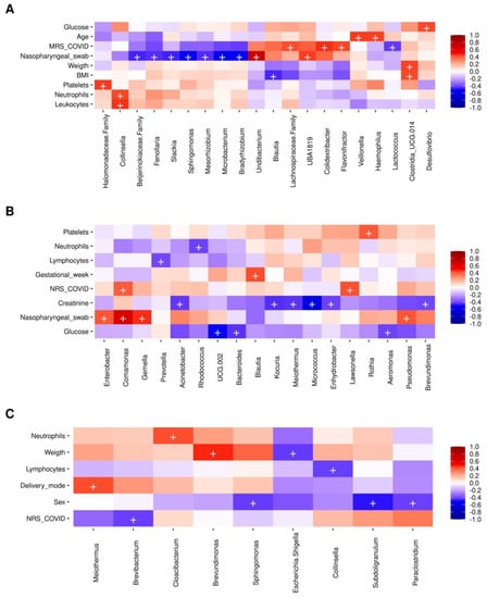 Spearman correlation analysis of clinical metadata and other variables, with bacterial abundance. (A) MRS (mother rectal swab); (B) HC (human colostrum), and (C) NRS (neonate rectal swab). The heatmaps show correlations between different bacterial taxa and numerical metadata. Columns show the bacterial taxa, while rows show the numerical metadata. The color keys from blue (−1, negative) to red (+1, positive) measure the correlation. The plus symbol “+” denotes a significance of p < 0.001. For the “Sex” variable, the blue color indicates a correlation of the bacteria with male children; for the “Delivery mode” variable, the red color indicates a correlation with vaginal delivery. Two MRS, two HC, and four NRS samples were not included in these analyses since they lacked suitable metadata.