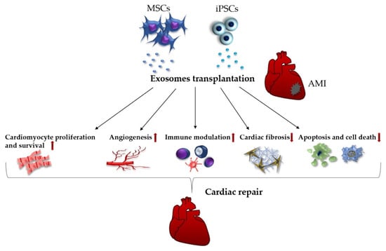 Similarly, EVs derived from iPSC-CMs have a strong therapeutic potential, mainly by circumventing the challenges associated with iPSCs themselves, such as tumorigenicity or chromosome aberrations. These findings support the study of Adamiak et al., who compared the regenerative effectivity of iPSCs and iPSC-EVs in a mouse MI model. As was expected, the iPSC-EVs caused more prominent improvement in left ventricular function and perfusion, as well as apoptosis and hypertrophy amelioration over the iPSCs []. In addition, Kurtzwald-Josefson et al. isolated exosomes from cardiac fibroblast-iPSCs and found that they exhibit lower expression of miR-22, a vital regulator of cardiac hypertrophy and remodeling, therefore making them a future potential source for myocardial recovery after MI []. The promising effects of exosome transplantation on different aspects of post-MI regeneration are depicted in Figure 1.