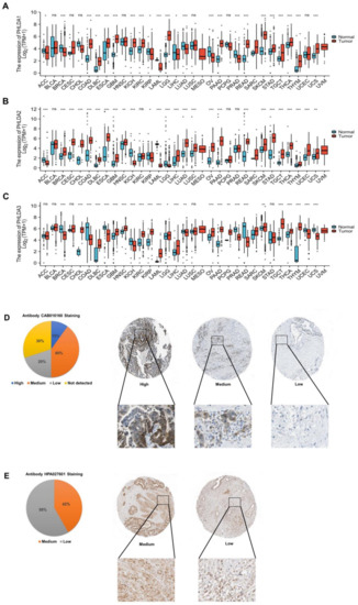 Expression analysis of the PHLDA family in pan-cancer and HPA analysis of PHLDA1/3 in PAAD. (A) The expression level of PHLDA1; (B) the expression level of PHLDA2; (C) the expression level of PHLDA3. ns, p ≥ 0.05; * p < 0.05; ** p < 0.01; *** p < 0.001. (D) The protein level of PHLDA1 (40×); (E) the protein level of PHLDA3 (40×).