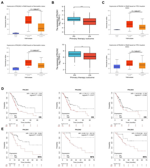 The relationship between expression levels of PHLDA family members and clinicopathologic features, TP53 mutation status, and prognosis of PAAD patients. (A) High expression of PHLDA2/3 was significantly correlated with a previous history of pancreatitis; (B) high expression of PHLDA1/2 was significantly correlated with a worse initial treatment effect; (C) the expression levels of PHLDA1/3 in the TP53 mutant PAAD tissues were significantly higher than those in the TP53 wild−type PAAD tissues; (D,E) the increased expression levels of PHLDA1 and PHLDA2 were significantly correlated with shorter OS and RFS. ** p < 0.01; *** p < 0.001.