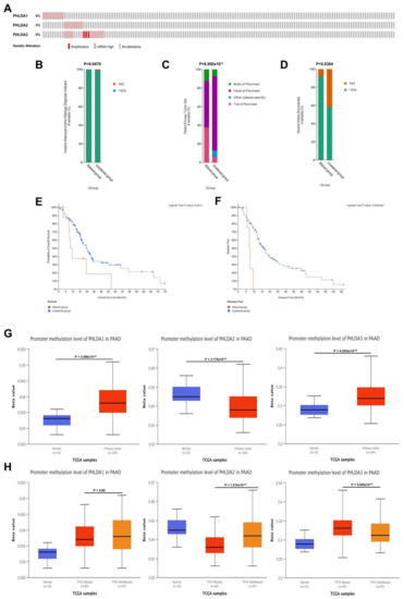 The cBioPortal database (http://www.cbioportal.org/) (accessed on 3 July 2022) was used to analyze the genetic variations of the PHLDA family members in PAAD, and the correlations between the variations and some clinicopathological characteristics were further determined [49]. Statistical significance was assessed by the chi-squared test, and p < 0.05 was considered statistically significant. In addition, the log-rank test was used to evaluate the statistical significance between PHLDA family member gene mutations and OS and disease-free survival (DFS) in PAAD patients, and p < 0.05 was considered statistically significant [50].