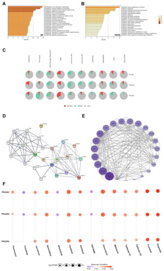 Gene enrichment analysis, PPI network construction, and drug sensitivity analysis of PHLDA Family in PAAD. (A) The GO enrichment of the BP terms of the PHLDA family and its 600 co-expressed genes; (B) the KEGG enrichment of the PHLDA family and its 600 co-expressed genes; (C) the PHLDA family played an activating role in a variety of oncogenic pathways; (D,E) TP53 played an important role in PPI network, which was closely related to the PHLDA family; (F) the expression of PHLDA family was negatively correlated with the sensitivity of various PAAD-targeting or chemotherapeutic drugs, including gemcitabine, docetaxel, and fluorouracil.