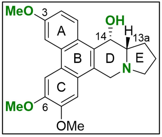 - Govindachari, T.; Viswanathan, N.; Radhakrishnan, J.; Pai, B.; Natarajan, S.; Subramaniam, P. Minor alkaloids of Tylophora asthmatica: Revised structure of tylophorinidine. Tetrahedron 1973, 29, 891–897. [Google Scholar] [CrossRef]