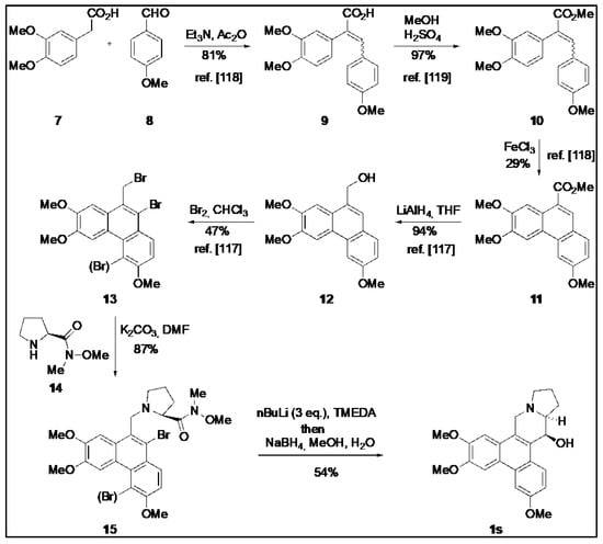 - Wang, K.-L.; Lü, M.-Y.; Wang, Q.-M.; Huang, R.-Q. Iron(III) chloride-based mild synthesis of phenanthrene and its application to total synthesis of phenanthroindolizidine alkaloids. Tetrahedron 2008, 64, 7504–7510. [Google Scholar] [CrossRef]