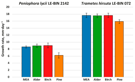 Growth rates of P. lycii LE-BIN 2142 and T. hirsuta LE-BIN 072 during their cultivation on MEA media containing various types of sawdust—alder, birch and pine. The MEA medium without sawdust addition was used as a control.