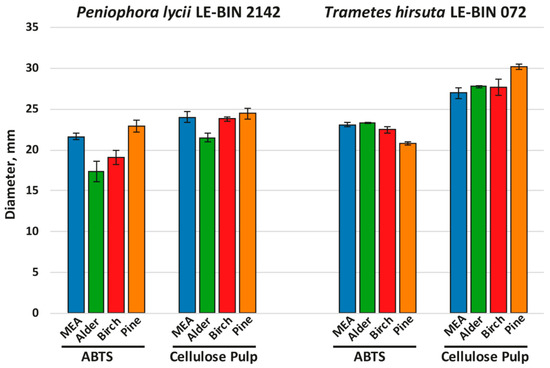 To investigate the growth on different woody substrates, both P. lycii LE-BIN 2142 and T. hirsuta LE-BIN 072 were cultivated on solid agar media containing malt extract and various types of sawdust—alder, birch and pine; the medium containing only malt extract was used as a control. After the fungal mycelium had completely overgrown the Petri dish, fungal overall oxidative and cellulolytic activities were measured by agar plate assays with ABTS and cellulose pulp as substrates. The fungal growth rates are presented in Figure 1, and fungal overall oxidative and cellulolytic activities are presented in Figure 2.