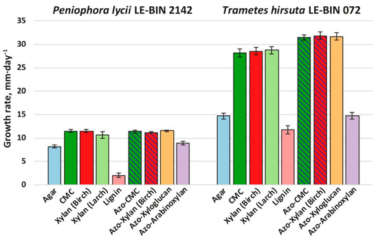 Growth rates of P. lycii LE-BIN 2142 and T. hirsuta LE-BIN 072 during their cultivation on solid agar media containing various wood components and their azo-labeled derivatives—CMC, birch xylan, larch xylan, lignin, azo-CMC, azo-birch xylan, azo-xyloglucan and azo-arabinoxylan. The control medium comprised agar as the only component. The azo-polysaccharide containing media for which counterparts without azo-labeling were tested are hatched.