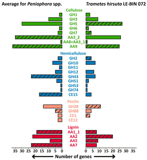 Unfortunately, direct comparisons of the P. lycii LE-BIN 2142 genome with that of other white-rot fungi is impossible since the genome of this fungus was not sequenced. However, we collected all the available genomes of fungi from the genus Peniophora and analyzed their genome content with respect to the genes encoding main wood-degrading enzymes [23]. The comparison of the genome contents of Peniophora spp. and T. hirsuta LE-BIN 072, as a typical representative of white-rot fungi, is shown in Figure 5. In general, the genome contents of Peniophora spp. and T. hirsuta LE-BIN 072 are typical for white-rot fungi. Both these genomes contain genes of CAZymes from the GH6, GH7, CE1 and AA2 families and CDH (AA8 + AA3_1), the presence of which are highly correlated with white-rot phenotype [24,25]. The main peculiarity of the Peniophora spp. genomes is an extreme expansion of genes encoding CAZymes from the AA9, AA7 and AA1_1 families, which is abnormal for typical white-rot fungi from Agaricales and Polyporales orders [24].