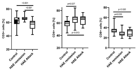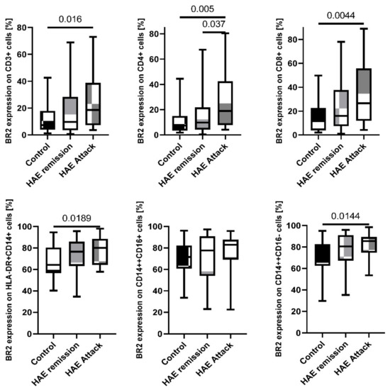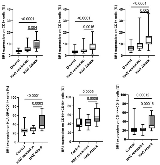| Healthy Control Group (% of Cells) | HAE Patients during Remission (% of Cells) | HAE Patients during Attack (% of Cells) | p-Value Attack vs. Control | |