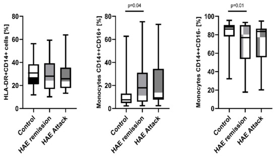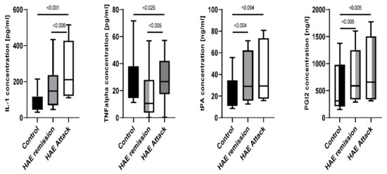 | Healthy Control Group | HAE Patients during Remission | HAE Patients during Attack | p-Value (Remission vs. Attack) | p-Value (Attack vs. Control) | |