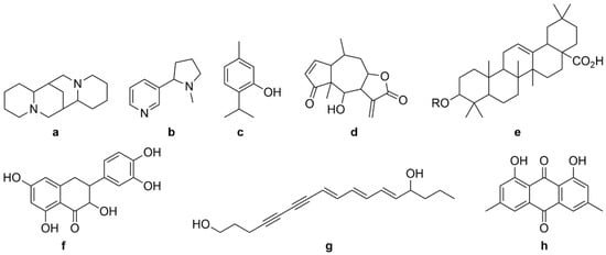 General structures of different categories of plant bioactive compounds: alkaloids (a,b), monoterpenes (c), sesqueterpenes (d), triterpenes, saponins, steroids (e), flavonoids (f), polyacetylenes (g), polyketides (h).