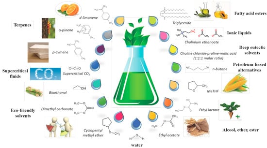 Examples of solvents used for extraction setups. Reproduced from [110] with permission (open access, Attribution 4.0 International (CC BY 4.0)).