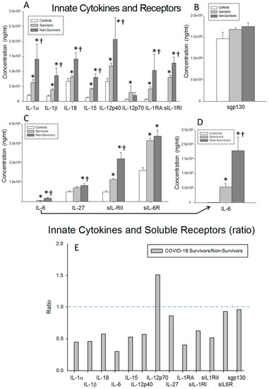 ) healthy controls. All the values are expressed as the means ± S.E.M.s *, p < 0.05 for surviving or non-surviving COVID-19 patients versus healthy controls. †, p < 0.05 for surviving versus non-surviving COVID-19 patients. (E) Data represent the ratios between the circulating levels in surviving and non-surviving COVID-19 patients of each soluble factor analyzed. The dotted line represents a reference line for the ratio equal to 1 between survivors and non-survivors.