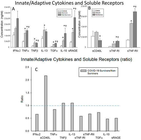 ) healthy controls. All the values are expressed as the means ± S.E.M.s *, p < 0.05 for surviving or non-surviving COVID-19 patients versus healthy controls. †, p < 0.05 for surviving versus non-surviving COVID-19 patients. (C) Data represent the ratios between the circulating levels in surviving and non-surviving COVID-19 patients of each soluble factor analyzed. The dotted line represents a reference line for the ratio equal to 1 between survivors and non-survivors.