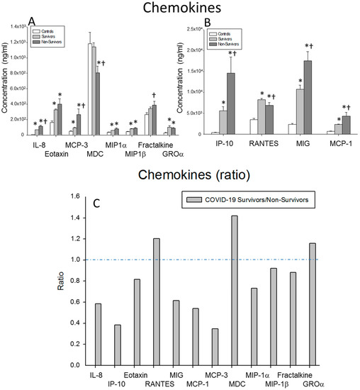) healthy controls. All the values are expressed as the means ± S.E.M.s *, p < 0.05 for surviving or non-surviving COVID-19 patients versus healthy controls. †, p < 0.05 for surviving versus non-surviving COVID-19 patients. (C) Data represent the ratios between the circulating levels in surviving and non-surviving COVID-19 patients of each chemokine analyzed. The dotted line represents a reference line for the ratio equal to 1 between survivors and non-survivors.