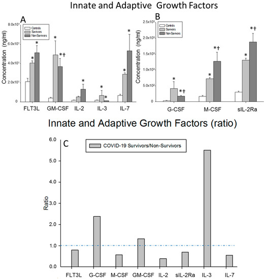 ) healthy controls. All the values are expressed as the means ± S.E.M.s *, p < 0.05 for surviving or non-surviving COVID-19 patients versus healthy controls. †, p < 0.05 for surviving versus non-surviving COVID-19 patients. (C) Data represent the ratios between the circulating levels in surviving and non-surviving COVID-19 patients of each growth factor analyzed. The dotted line represents a reference line for the ratio equal to 1 between survivors and non-survivors.