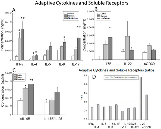 ) healthy controls. All the values are expressed as the means ± S.E.M.s *, p < 0.05 for surviving or non-surviving COVID-19 patients versus healthy controls. †, p < 0.05 for surviving versus non-surviving COVID-19 patients. (D) Data represent the ratios between circulating levels of surviving and non-surviving COVID-19 patients. The dotted line represents a reference line for the ratio equal to 1 between survivors and non-survivors.