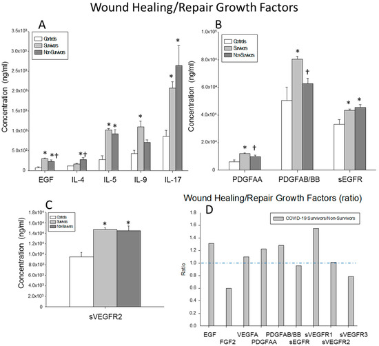 ) healthy controls. All the values are expressed as the means ± S.E.M.s *, p < 0.05 for surviving or non-surviving COVID-19 patients versus healthy controls. †, p < 0.05 for surviving versus non-surviving COVID-19 patients. (D) Data represent the ratios between the circulating levels in surviving and non-surviving COVID-19 patients of each wound-healing and repair growth factor analyzed. The dotted line represents a reference line for the ratio equal to 1 between survivors and non-survivors.