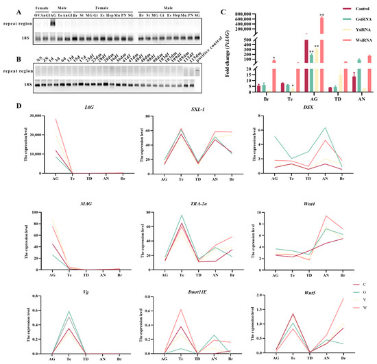 4.4. Amplification of PcIAG Repeat Regions in Male and Female Procambarus Clarkii DNA, and Different Tissues and Different Developmental Stages of Procambarus Clarkii