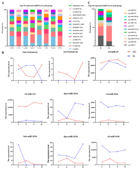 | After siRNA Interference with PcIAG, the Top 10 miRNAs Expressed | miRNA Sequence | miRNAs in Exosomes before and after the Androgenic Gland Ablation |