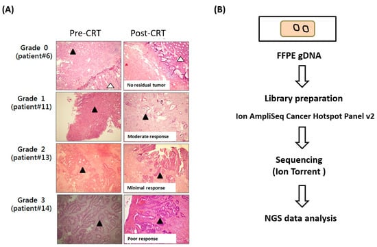 Identification of gene variants in rectal carcinoma through NGS. (A) Histopathological examination of biopsy specimens collected from patients with rectal carcinoma before nCRT (left panels). Histopathological examination of surgery specimens collected from patients with rectal carcinoma after nCRT (right panels). The black triangle indicates tumor cells, and the white triangle indicates the normal tissue. The response to nCRT was determined on the basis of the tumor regression grade. The image of specimens was determined through the microscope (magnification with 40× lens). (B) Targeted NGS workflow. Ten nanograms of genomic DNA was used for AmpliSeq cancer panel library preparation. Ion and high-throughput sequencing was performed using ion Torrent.
