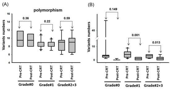 Through sequencing, we identified 648 variants (frequency > 5%) in 50 genes, including 297 nonsynonymous and 351 synonymous variants (Supplementary Tables S2–S4). Furthermore, we determined that the number of single nucleotide polymorphism (SNP) did not significantly differ between the pre-nCRT and post-nCRT specimens (Figure 2A). The number of gene mutations was lower in the post-CRT specimens than in the pre-CRT specimens (Figure 2B).