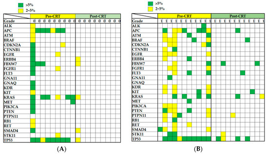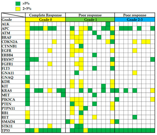 Gene mutation status was examined in biopsy samples from patients with rectal carcinoma. Mutation profiles of biopsy specimens collected from 29 patients with rectal carcinoma before CRT, including 9 patients with grade 0, 11 patients with grade 1, and 9 patients with grade 2 or 3. A green square indicates that a mutation with a frequency of >5% was detected in the gene, a yellow square indicates that a mutation with a frequency of 2–5% was observed in the gene, and an empty square indicates that no relevant mutation was observed for the gene.