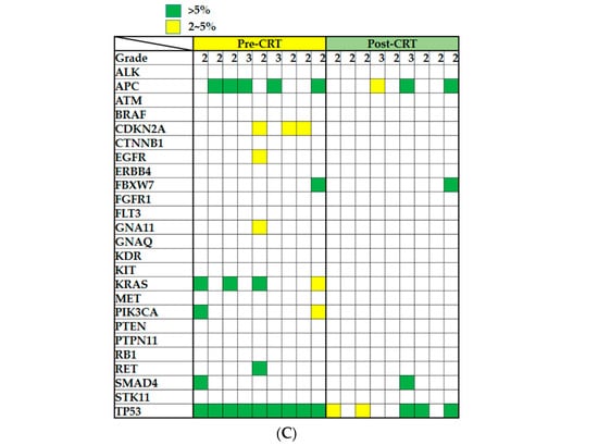 After the excision of the tumor, gene mutations should be gradually decreased during the nCRT process, especially in patients exhibiting a complete response. If a gene mutation contributes to nCRT resistance in rectal carcinoma, it should be retained after nCRT. Our data revealed that most of the mutations disappeared after the completion of nCRT in the patients exhibiting a complete response (Figure 4A). We compared the mutation status between the pre-nCRT and post-nCRT specimens in the patients exhibiting a poor response and observed that some of the gene mutations were retained, namely APC, BRAF, FBXW7, FLT3, KIT, KRAS, PTPN11, SMAD4, STK11, and TP53 (Figure 4B,C and Table 3). Among them, three gene mutations, BRAF, SMAD4, and TP53, were more frequently observed in the poor response group than in the complete response group (Figure 3 and Table 2). On the basis of these complex mutational profiles in rectal carcinoma, we speculated about the involvement of BRAF, SMAD4, and TP53 gene mutations in the outcomes of nCRT in patients with rectal carcinoma.