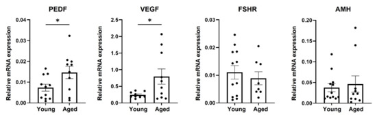 mRNA expression of selected genes in mouse granulosa cells. Mouse granulosa cells were isolated from individual young (“Young”; 6–8 weeks old) and RA (“Aged”; 40–46 weeks old) ICR female mice, primed for 48 h with PMSG (5IU or 7.5 IU, respectively). Cells were then subjected to qPCR analysis of PEDF, VEGF, FSHR, and AMH expression. Number of mice in each group: n > 15; each black circle represents one mouse. Data are presented as mean ± SEM. Results were analyzed by Student’s t-test with Welch’s correction, * pv ˂ 0.05.