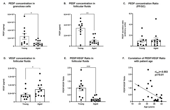 PEDF and VEGF protein in human GCs and in FF. phGCs extracts and FFs of IVF patients: phGCs and FFs of young (“Young”; 20–35 y; N = 10) and RA patients (“Aged”; 36–44 y; N = 11) were collected individually and subjected to specific ELISA assay kits. (A,B) The level of PEDF in GCs extracts (A) and in their corresponding FFs (B). (C) PEDF concentration ratio, calculated by dividing the level of PEDF in FFs by its level in GCs. (D) The level of VEGF in FFs. (E) PEDF/VEGF ratio in FFs. Each black circle represents one patient. Data are presented as mean ± SEM. Results were analyzed by Student’s t-test with Welch’s correction. * pv < 0.05; ** pv < 0.01; *** pv < 0.001. (F) Spearman correlation analysis of PEDF/VEGF ratio to patients’ age.