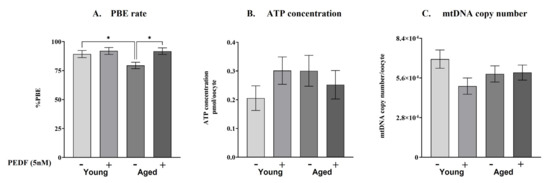 PBE rate, ATP concentration, and mtDNA copy number in mouse oocytes matured in vitro. GV oocytes were isolated from individual young (“Young”; 6–8 weeks old) and RA (“Aged”; 40–46 weeks old) ICR female mice, primed for 48 h with PMSG (5IU or 7.5 IU, respectively) and subjected to IVM with (+) or without (−) 5 nM rPEDF. (A) After 20 h of IVM, the PBE rate was calculated and recorded for each mouse individually. Total number of oocytes in each group: n ≥ 84. (B,C) MII oocytes (after IVM) were individually collected, lysed, and subjected to analysis of ATP concentration or mtDNA copy number. Total number of oocytes per experimental group: n ≥ 19. Each group contained oocytes from at least four mice. Data are presented as mean ± SEM. Results were analyzed by one-way ANOVA with FDR correction, * pv < 0.05.