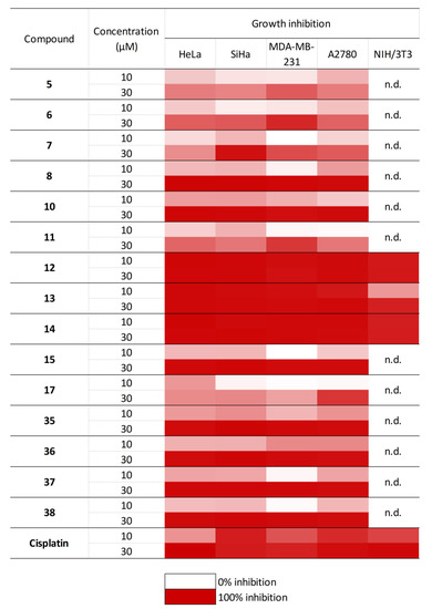 The growth-inhibitory effects of the gibberellic acid-based aminodiol derivatives were determined by a standard MTT (3-(4,5-dimethylthiazol-2-yl)-2,5-diphenyltetrazolium bromide) assay on a panel containing five cell lines, including Hela and Siha (cervical cancers); MDA-MB-231 and MCF-7 (breast cancers); and A2780 ovarian cancer cells. The most promising agents were additionally tested against NIH/3T3 mouse embryo fibroblast cells. All cell lines were purchased from the European Collection of Cell Cultures (Salisbury, UK) except SiHa, which was obtained from the American Tissue Culture Collection (Manassas, VA, USA) [48]. The cells were maintained in minimal essential medium supplemented with 10% fetal bovine serum, 1% non-essential amino acids, and 1% penicillin-streptomycin at 37 °C in a humidified atmosphere containing 5% CO2. All media and supplements were obtained from Lonza Group Ltd., (Basel, Switzerland). Cancer cells were seeded into 96-well plates (5000 cells/well), after an overnight incubation the test compound was added in 2 different concentrations (10 µM and 30 µM) and incubated for another 72 h under cell-culturing conditions. Then, 20 μL of 5 mg/mL MTT solution was added to each well and incubated for a further 4 h. The medium was removed, and the precipitated formazan crystals were dissolved in DMSO during 60 min of shaking at 37 °C. As the final step, the absorbance was measured at 545 nm by using a microplate reader (SPECTROStar Nano, BMG Labtech, Offenburg, Germany). Untreated cells were included as controls. In case of the most effective compounds (i.e., compounds eliciting higher than 50 or 85% at 10 or 30 μM, respectively), the assays were repeated with a set of dilutions (0.1–30.0 μM) to determine the IC50 values. These agents were additionally tested against NIH/3T3 fibroblasts to obtain results about their cancer selectivity. Two independent experiments were performed with five wells for each condition. Cisplatin (Ebewe GmbH, Unterach, Austria), a clinically used anticancer agent, was used as a positive control. Calculations were performed utilizing the GraphPad Prism 5.01 software (GraphPad Software Inc., San Diego, CA, USA).