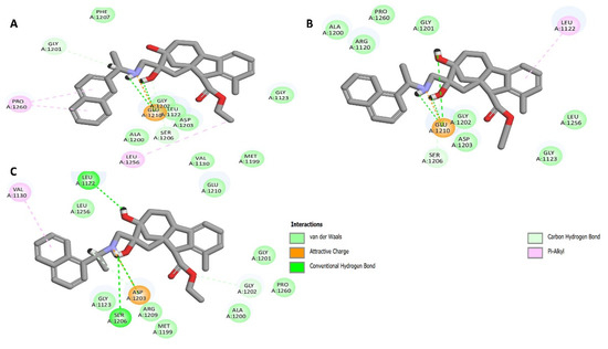 2D Diagram of the interactions between (A) compound 12, (B) compound 13, and (C) compound 14 with ALK ATP binding site.