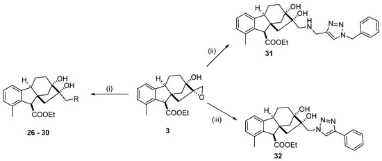 Nowadays, CuAAC reaction (copper-catalyzed azide-alkyne cycloaddition) has become the main approach to access 1,2,3-triazoles with high regioselectivity [43]. In order to expand the family of allo-gibberic acid-based azole scaffolds, oxirane 3 was subjected to ring-opening reaction using propargyl amine in acetonitrile under reflux conditions and subsequent 1,3-dipolar cycloaddition reaction [30]. This method is typically called Huisgen cycloaddition [44]. In our case, the reaction of terminal acetylene bearing N-propargyl-substituted aminodiol with benzyl azide under Sharpless click chemistry conditions (CuSO4·5H2O and sodium ascorbate in t-BuOH/H2O (2:1)) afforded 1,4-disubstituted-1,2,3-triazole 31 in a regioselective manner in satisfactory yield [30]. On the other hand, various triazole derivatives of allo-gibberic acid were synthesized through azide-generated epoxide 3 and NaN3 followed by Cu(I)-catalyzed alkyne−azide [3 + 2] cycloaddition of the corresponding azide with phenylacetylene to produce target compound 32 in good yield (Scheme 4) [30].