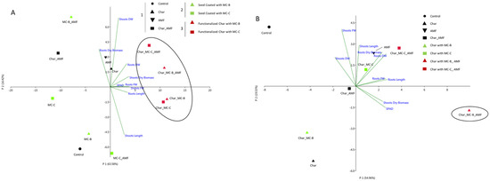 PCA analysis of the physiological growth data obtained for wheat (A) and maize (B) in response to different treatments. (A) Wheat treatments were 1 “Control” group (Control, Char, AMF, Char_AMF); 2 “Seed coating” group (MC-B, MC-C, MC-B_AMF, MC-C_AMF); 3 “Functionalized Char” group (Char_MC-B, Char_MC-C, Char_MC-B_AMF, Char_MC-C_AMF). (B) Maize treatments were “Control” group (Control, Char, AMF, Char_AMF); functionalized char group without AMF (Char_MC-B, Char_MC-C), and functionalized char with AMF (Char_MC-B_AMF, Char_MC-C_AMF). The colors and symbols are ordered according to the legend reported. The main groupings are indicated in circles.
