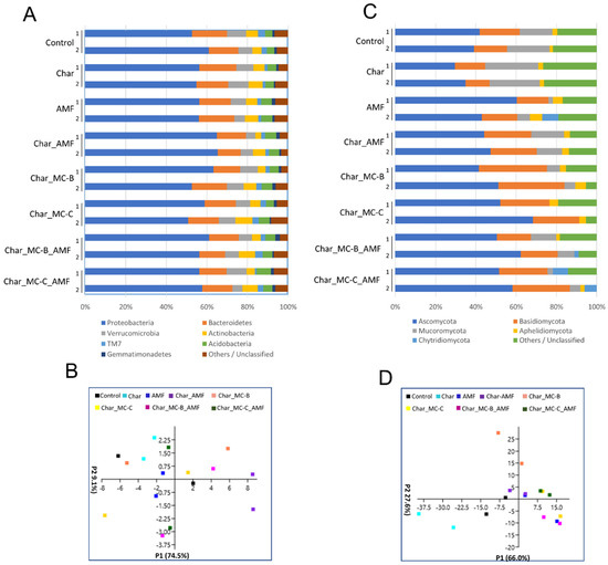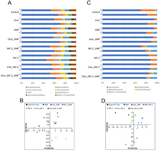 The most abundant bacterial phyla in all samples were Proteobacteria, accounting for over 55% of the total sequences, followed by Bacteroidetes with ~11% and then Verrucomicrobia, Actinobacteria, Acidobacteria, TM7 (Saccharibacteria), and Gemmatimonadetes, whose abundance ranged from 3 to 8% (Figure 2A). PCA was employed to generate a global overview of the data (Figure 2C). The Proteobacteria population was the main factor in the first principal component axis (P1), accounting for 69.6% of the total variation, whereas TM7 was the main factor in the second P2 axis. Proteobacteria include important species such as Pseudomonas sp. and Burkholderia sp. [58,59,60] and Azospirillum sp. and Azotobacter sp., which are nitrogen-fixing bacteria, whereas TM7 are hydrocarbon decomposers; however, so far, little is known about their characteristics as they have not yet been successfully isolated and cultivated [61,62]. Figure 2C,D show that the MC-C_AMF and Char_MC-C_AMF data were more similar. These results also show a similar combined effect of MC-C and AMF on the rhizospheric soil population, independent of their delivery method (see Materials and Methods Section 3.2 and Section 3.3). For Proteobacteria, the most represented classes were Alphaproteobacteria, Gammaproteobacteria, Saprospirae, Actinobacteria, and Betaproteobacteria, together accounting for over 60% of the retrieved sequences (Figure S3A).