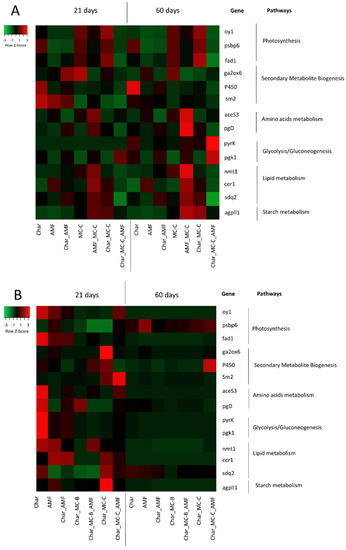 At 21 DAS, the genes that were upregulated belonged to six metabolic pathways: amino acid metabolism (pgd), starch metabolism (agpll1), photosynthesis (fad1, oy1), lipid metabolism (cer1, nmt1), secondary metabolite biogenesis (P450, sm2), and glycolysis/gluconeogenesis (pgk, pyrk). Plants treated with MC-B or C showed that the genes involved in the photosynthesis pathway were strongly up-regulated compared to the control conditions. The condition Char_ MC-C_ AMF determined a strong induction (FC > 4) of 9 genes (aceS3, agpll1, cer1, fad1, nmt1, oy1, pgk, and pyrk) involved in different metabolic pathways.