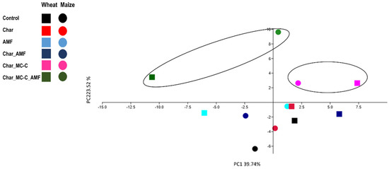 By considering the plant responses, physiological and gene expression data, and PCA analysis specific to wheat and maize, the results obtained confirmed that the treatments with Char_MC-C_AMF and Char_MC-B_AMF for wheat and maize, respectively, were those that accounted for most of the variances observed (Figures S6 and S7).